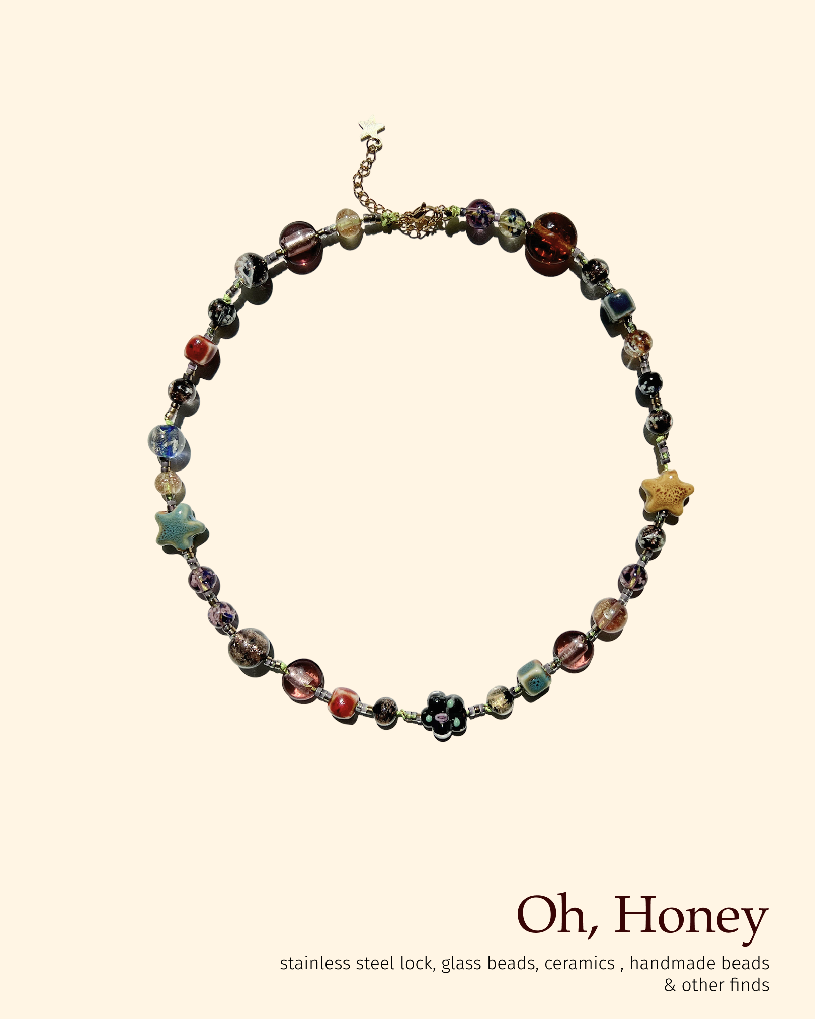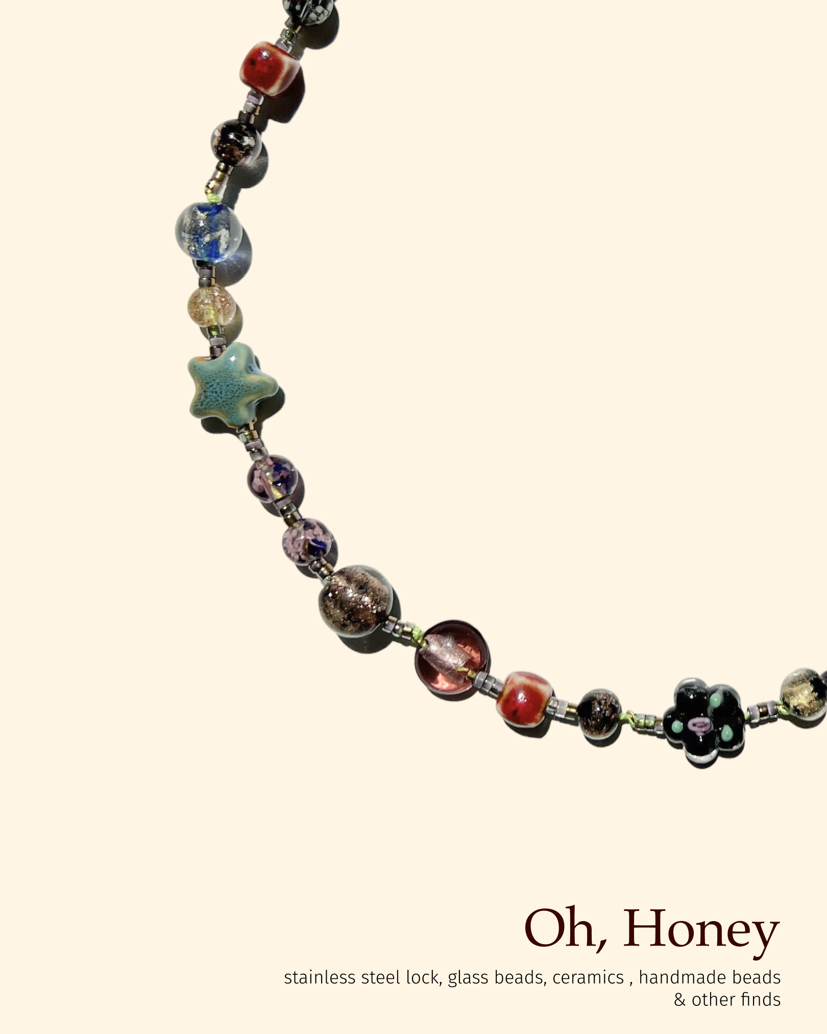 Materials: stainless steel lock, glass beads, ceramics, handmade beads & other finds