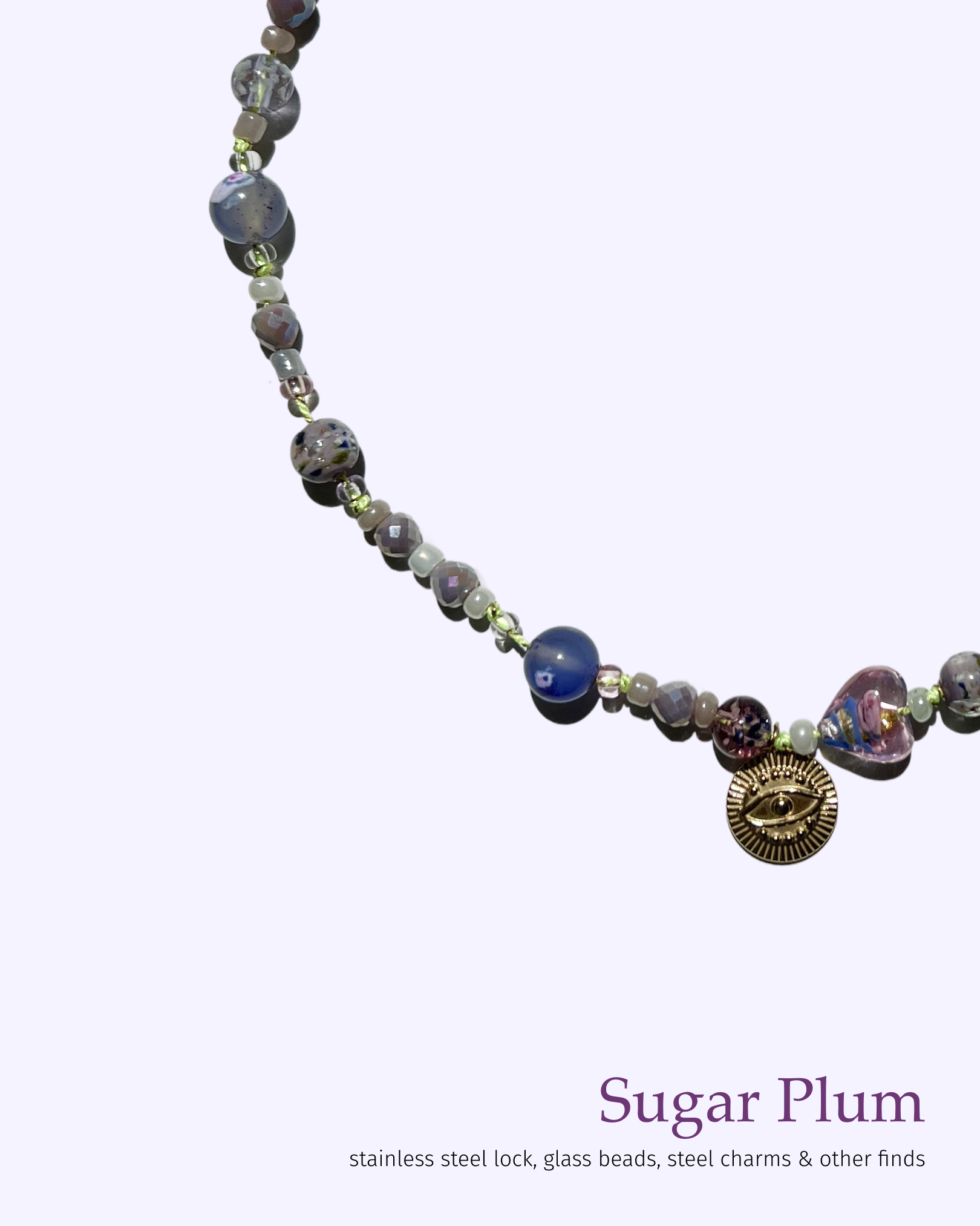 Materials: stainless steel lock, glass beads, handmade beads, steel charms & other finds