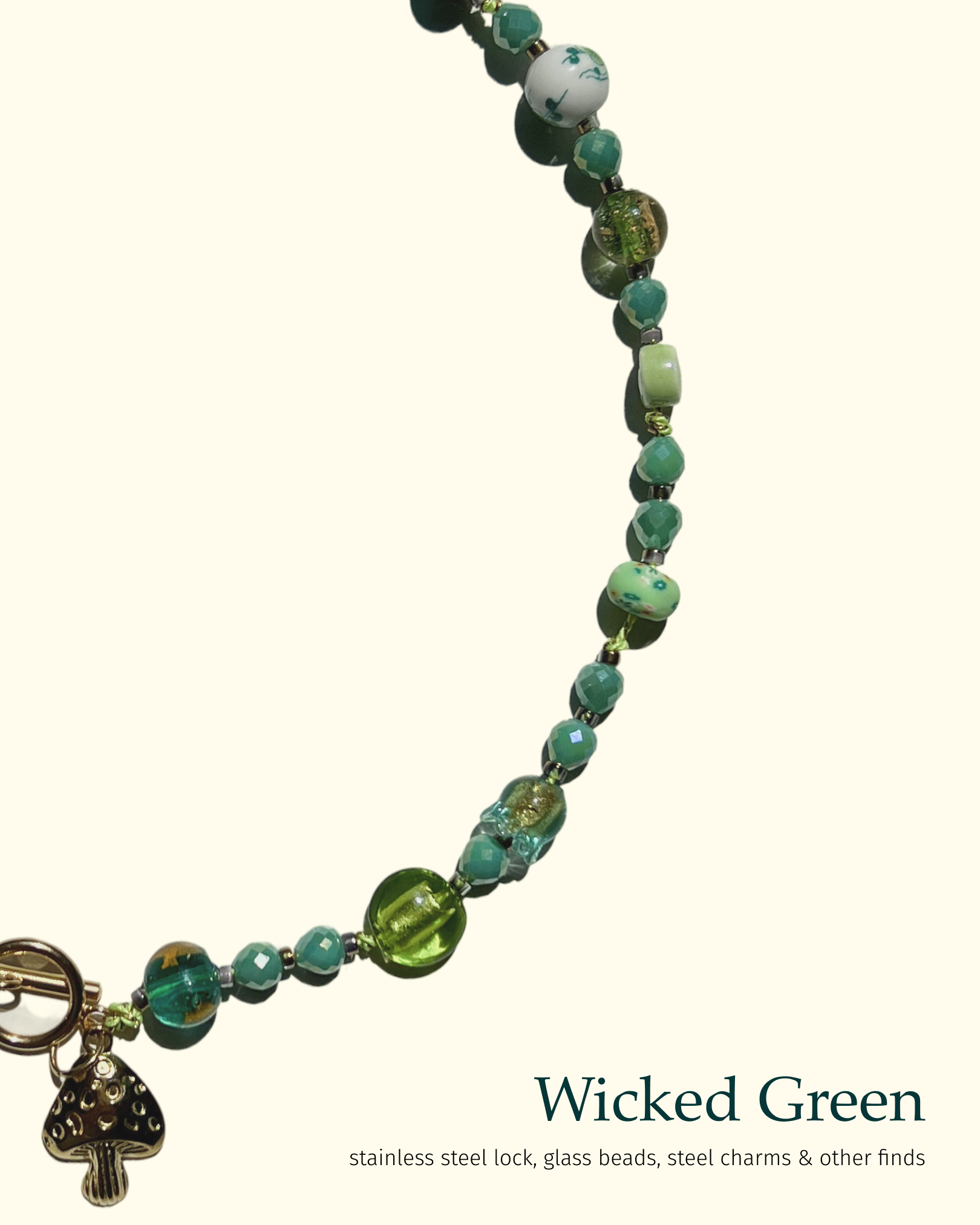 Materials: stainless steel lock, glass beads, steel charms & other finds